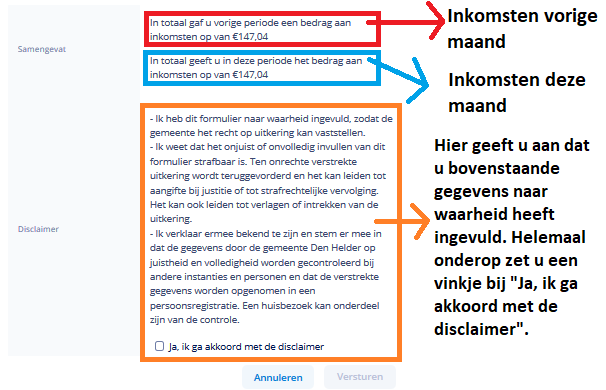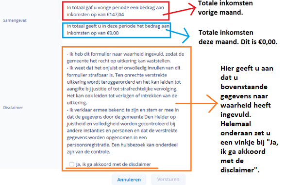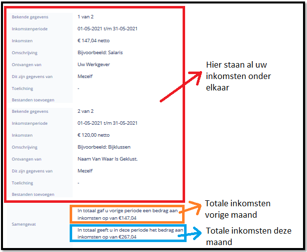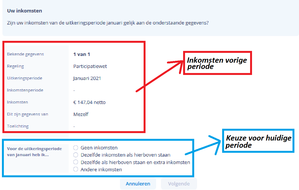 Op de volgende pagina ziet u een overzicht van uw inkomsten in de vorige periode. Daaronder geeft u aan wat voor u geldt. U kunt één van de vier keuzes uitkiezen: