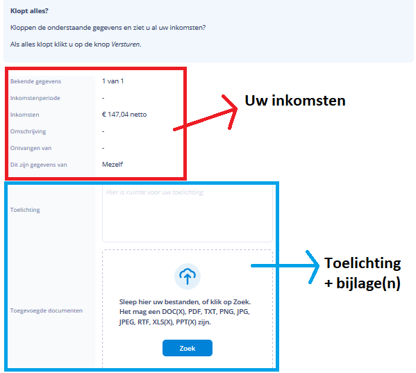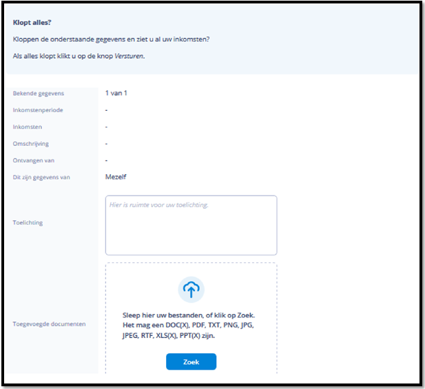 Als u een inkomstenverklaring open heeft staan, dan ziet u in het beginscherm een rood uitroepteken. Klik op de tekst “uw inkomsten controleren”. Ook staat er voor wanneer dit moet worden ingeleverd. Als er geen rood uitroepteken en de tekst “uw inkomsten controleren” staat, betekent dit dat er geen inkomstenverklaring voor u open staat. U hoeft dan niks te doen.