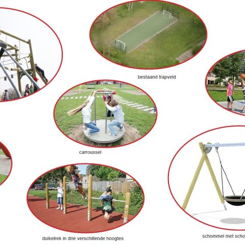 Er komt een klimtoestel, veerwip, schommel met schommelmand en een duikelrek met drie hoogtes te staan in het gras. Voor de sportievelingen komt er een basketbalpaal en het trapveldje blijft bestaan.
