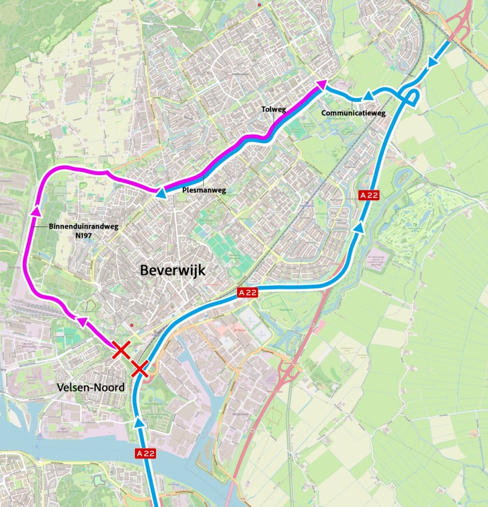 De Velsertraverse sluit van vrijdag 15 mei (20.00 uur) t/m maandag 18 mei (05.00 uur) én van vrijdag 22 mei (20.00 uur) t/m donderdag 28 mei (05.00 uur). Weggebruikers worden tijdens de afsluitingen met borden omgeleid. De hoofdroute voor regulier verkeer loopt via Heemskerk.